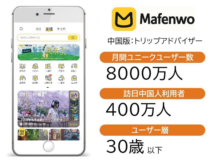 ■中国最大級の旅行口コミSNS。中国人の旅行計画や口コミ発信に大きな影響を持つプラットフォームです。中国の若年層に利用されている最新型サイト。ユーザーが旅の計画、旅行、そして口コミ投稿を行い、さらにその情報を見た人が旅行に行くという情報拡散のサイクルが生まれている。https://www.mafengwo.cn/