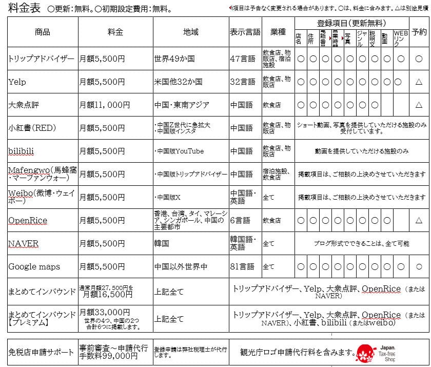 インバウンド需要の高まりに対応するには、媒体の拡充が不可欠です。 自店での個別更新は手間がかかり、他社依頼では高額になることも。 たとえば大衆点評のベーシックプランでは月額約¥30,000〜¥65,000の例もありますが、弊社では月額¥5,500~(定期契約)で対応可能です。 低コストで複数媒体を一括管理し、常に最新情報を発信。 すでに海外媒体に掲載済みの方も、媒体追加で訪日客へのアプローチを最大化できます。 「まとめてインバウンド」では、10媒体の中から4媒体を選んでご提供します。